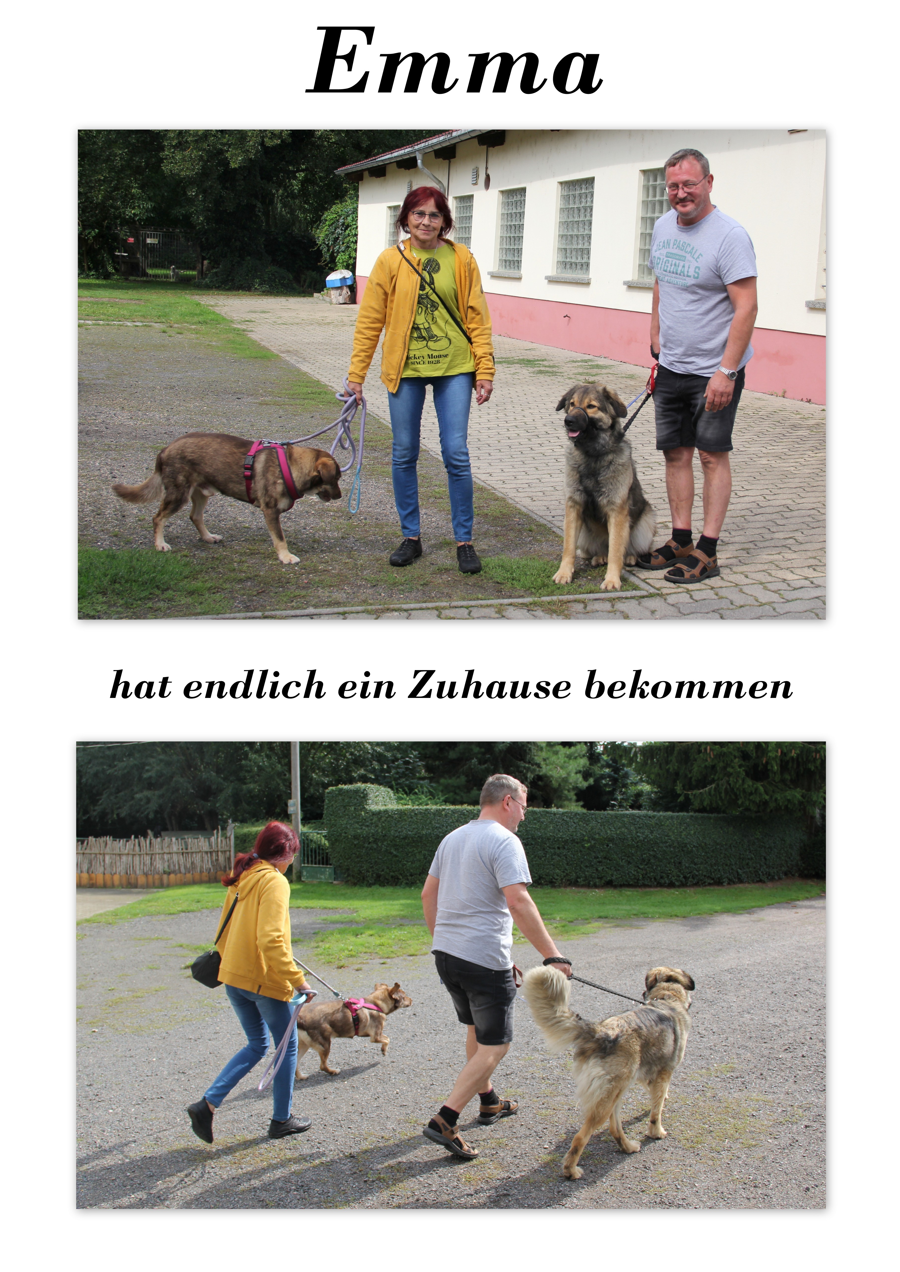 Es gibt manchmal Situationen, da kommen uns die Tränen. So lang musste Emma auf diesen Augenblick warten. Wie schnell sich doch das Schicksal zum Guten wenden kann. Für Emma ein klarer Glücksfall. Natürlich waren wir gespannt auf den ersten Anruf von zu Hause. Sie lebt nun in der wunderschönen Gegend von Brandenburg, geht schwimmen und läuft super am Fahrrad. Wenn es „Karmel“ mit laufen zu viel wird, sitzt er in einem Hundekinderwagen und Emma läuft daneben. Was für ein wunderschönes Gefühl zu wissen, das es ihr so richtig gut geht. Auch wenn hier und da noch ein paar Erziehungsregeln aufgestellt werden müssen, so sagen Carmen und Reinhold doch: