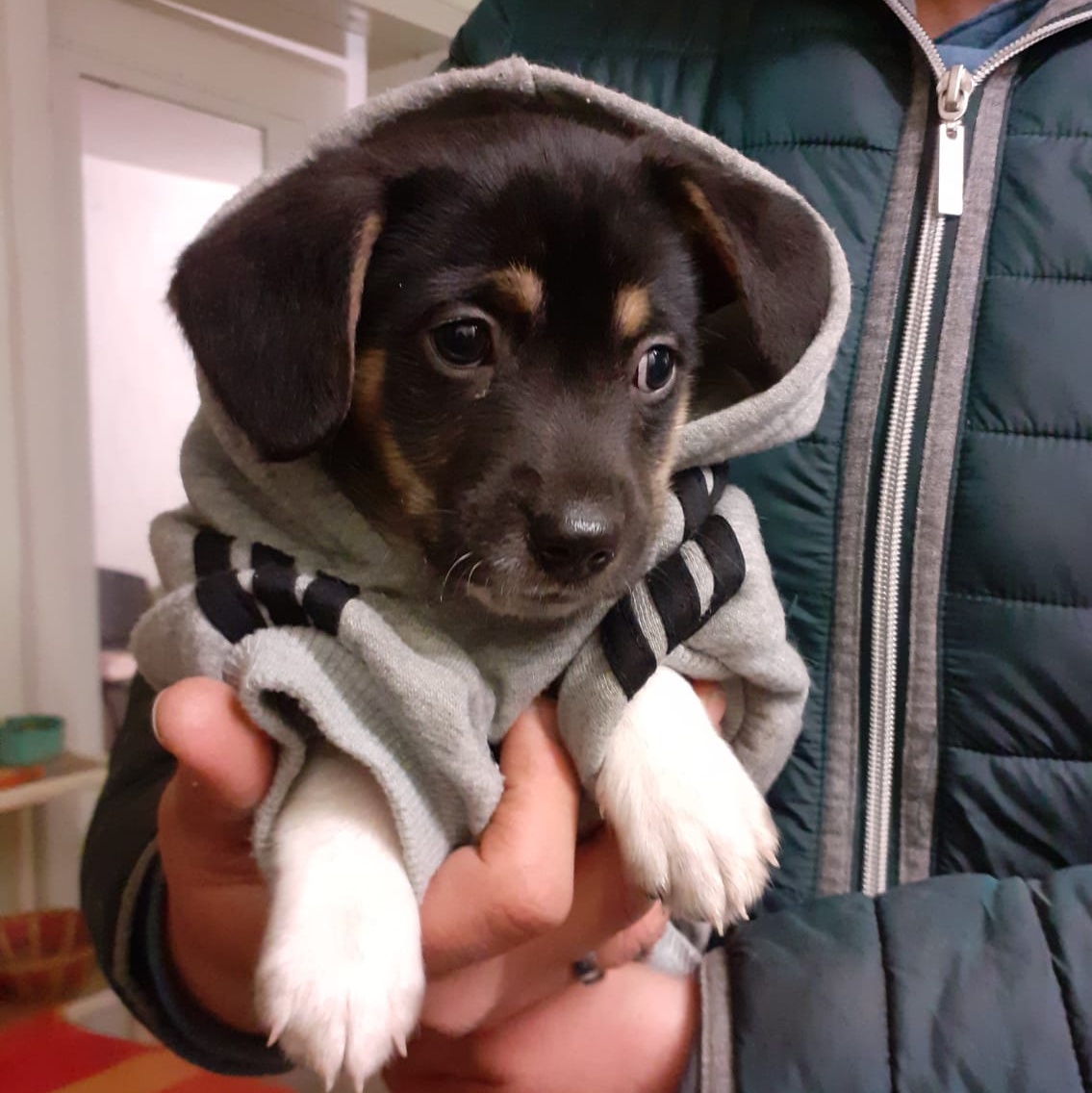 Paint – gerade mal 8 Wochen alt – hatte einen sehr schweren Start in sein Leben. Die Geburt der Welpen war schwierig, Paint steckte zu lang im Geburtskanal fest. Dennoch kam er auf die Welt, jedoch mit gesundheitlichen Problemen. Er war der kleinste Welpe und konnte seine Hinterpfoten nicht benutzen. Immer wieder kippte er um, konnte Kot und Urin nicht kontrolliert absetzen. Er wurde tierärztlich untersucht und seine Prognose war nicht eindeutig.