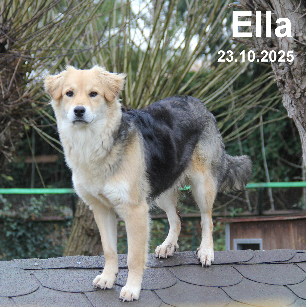 Ella---- Rasse: Mischling (11,2 kg)---- Schulterhöhe: ca 50 cm (wächst noch)---- Geschlecht: weiblich, geimpft, gechipt---- geboren: 24.04.2025---- Ella - eine sehr verspielte und temperamentvolle junge Hündin, die momentan mit unserem Rüden Erwin zusammen auf seinem Freilauf über die Wiese tobt. Menschen gegenüber ist sie sehr offen, natürlich muss sie nun das 1-Mal-1 einer guten Erziehung erlernen. Sie möchten Ella kennenlernen? Dann vereinbaren Sie bitte einen Termin mit uns.