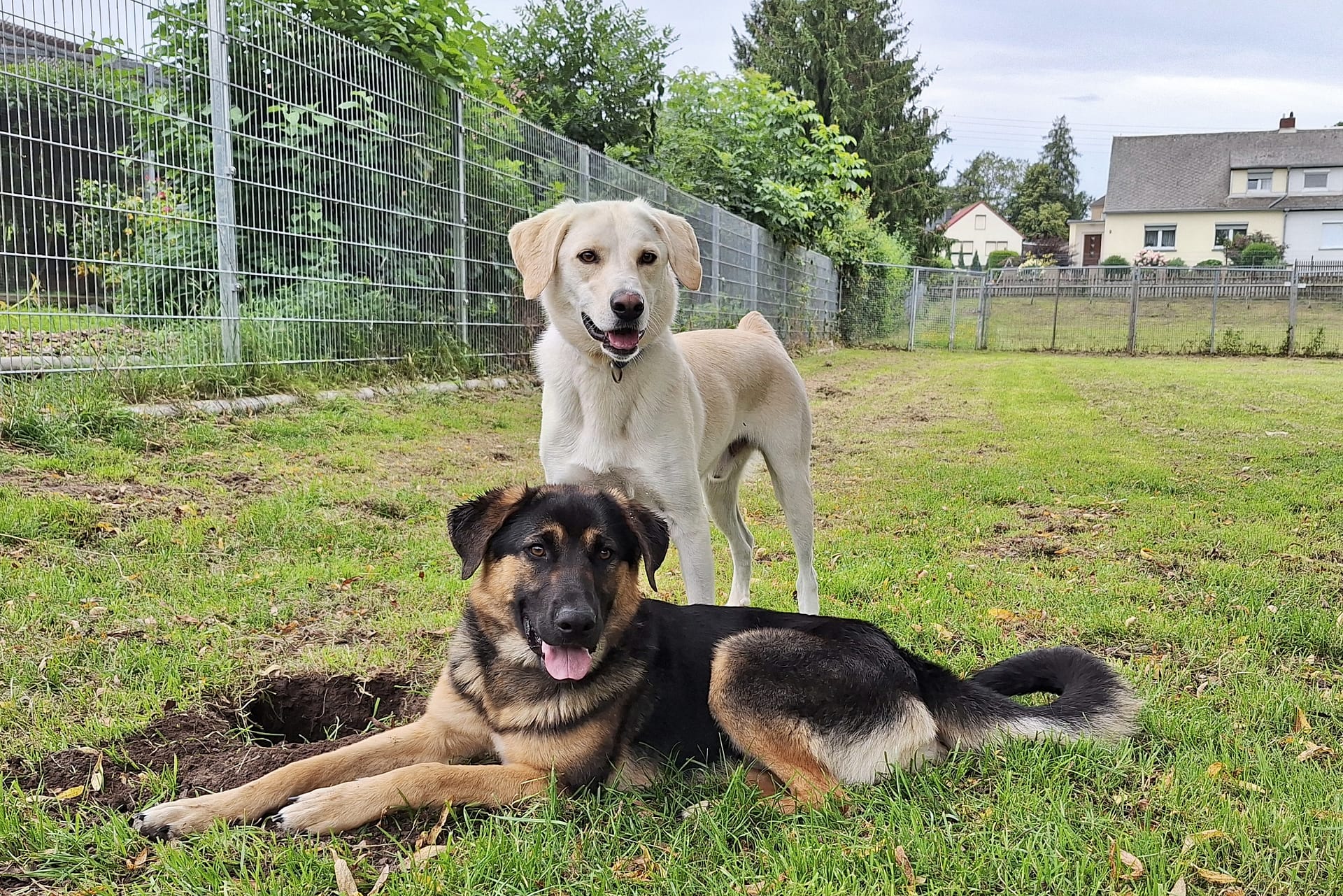 Nicht immer klappt eine Zusammenführung zwischen Hunden. Da Vito und Lea leider doch nicht zusammen vermittelt werden konnten, stand der junge Rüde auf einmal allein auf seiner Koppel. Und Vito ist nicht gern allein. Da überwindet er ohne Mühe schon mal einen 2-Meter-Zaun. Aber wir wussten – er ist mit anderen Hunden verträglich. Auch Rudi, der nun schon 2 Jahre bei uns lebt, liebt die Gesellschaft mit anderen Hunden. Anfangs hatten wir Bedenken, da Rudi kastriert ist, aber Vito nicht. Größen- und kräftemäßig könnte aber passen – also probierten wir es.