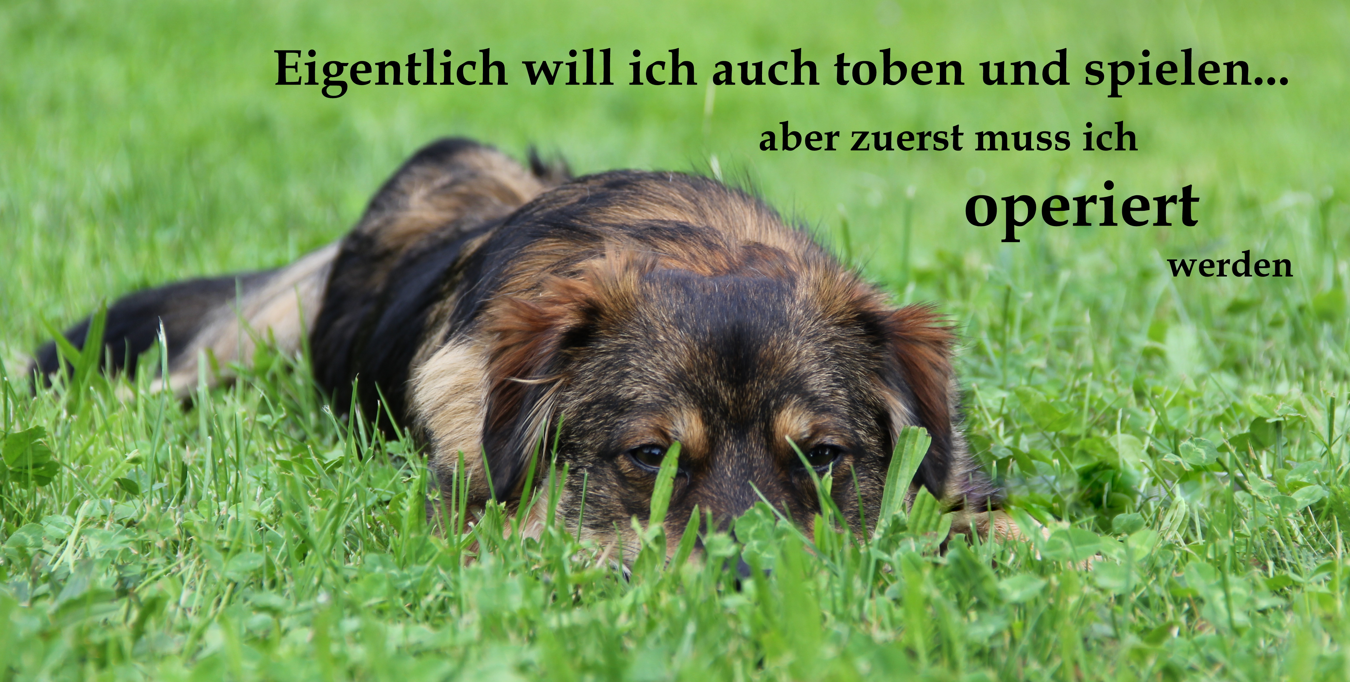 Sein Blick ist traurig, sein Kopf im Gras gesenkt und am liebsten würde er mit den anderen Hunden spielen und toben. Aber er kann nicht. Schmerzen plagen diesen jungen Hund.